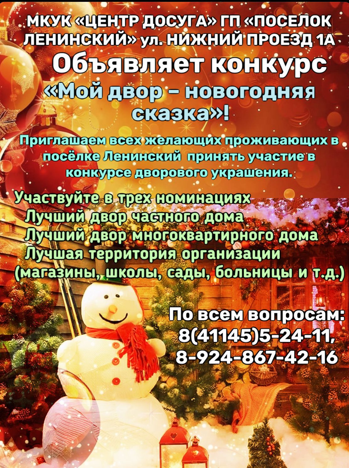 Жители поселка Ленинский! Превратим наш поселок в самую уютную и праздничную новогоднюю сказку! Приглашаем всех желающих принять участие в конкурсе дворового украшения.Участвуйте в трех номинациях: "Лучший двор частного дома", "Лучший двор многоквартирного дома", "Лучшая территория организации" (магазины, школы, сады, больницы и т.д.). Как принять участие? Украсьте двор или территорию в новогоднем стиле. Подайте заявку до 7 декабря 2025 года по телефону: 8 (41145) 5-24-11 или 8-924-867-42-16. Укажите в заявке: номинацию, адрес, ФИО представителя и контактный телефон. Важно! 8 и 9 декабря конкурсная комиссия выедет для оценки всех участников. Победителей в каждой номинации ждут дипломы и призы! Все участники получат сертификаты участников конкурса. Участие в Конкурсе означает согласие автора на возможное размещение фотографий,работ на сайте и в социальных сетях организатора с указанием имени автора. Торжественное награждение победителей состоится 12 декабря 2025 года на открытии поселковой елки! На территории стадиона «Открытый каток» по улице Первомайская ГП «Посёлок Ленинский». Пусть ваш двор станет самым красивым и праздничным уголком поселка! Ждем ваши заявки!