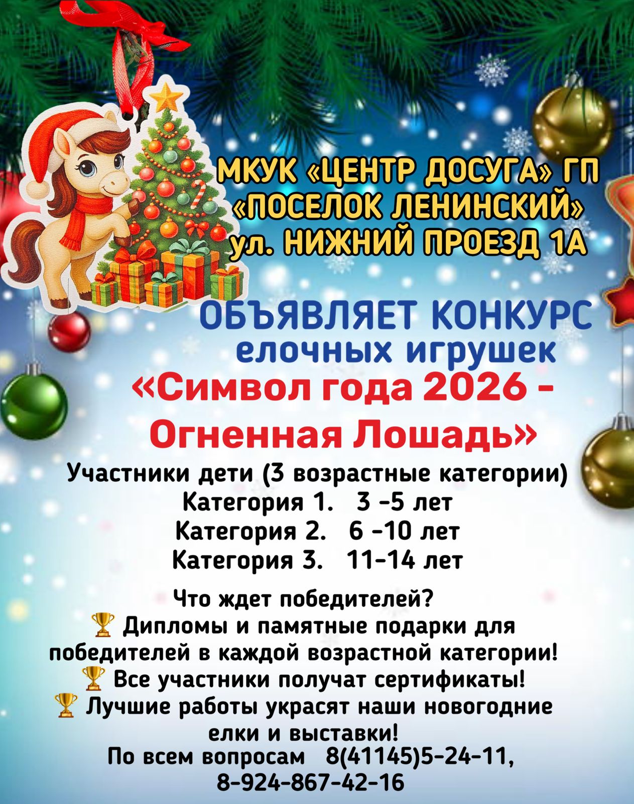 Друзья! Приглашаем юных мастеров и мастериц до 14 лет создать своими руками главное новогоднее украшение - символ наступающего 2026 года! Условия просты: участники: дети 3-14 лет (3 возрастные категории): категория 1: 3-5 лет, категория 2: 6-10 лет, категория 3: 11-14 лет. Задача: сделать елочную игрушку в виде Лошади, Коня или Жеребенка. Сроки: приносите работы с 19 ноября по 10 декабря 2025 года по адресу: ул. Нижний проезд, д.1а (МКУК «Центр досуга»). Важные требования: Размер игрушки: от 10 до 25 см, Надежное крепление (петелька, ниточка). Прочные и безопасные материалы. С обратной стороны должна быть этикетка с именем, возрастом и названием работы. К игрушке приложите заявку: Имя ребенка, возраст, телефон для связи. Что ждет победителей? Дипломы и памятные подарки для победителей в каждой возрастной категории! Все участники получат сертификаты! Лучшие работы украсят наши новогодние елки и выставки Участие в Конкурсе означает согласие автора и его законных представителей на возможное размещение фотографий работ на сайте и в социальных сетях организатора с указанием имени автора. Работы, представленные на Конкурс, не возвращаются и могут быть использованы организатором для украшения интерьеров и выставок. Творите, фантазируйте и дарите праздник своими руками! Подведение итогов и награждение - 12 декабря 2025 г